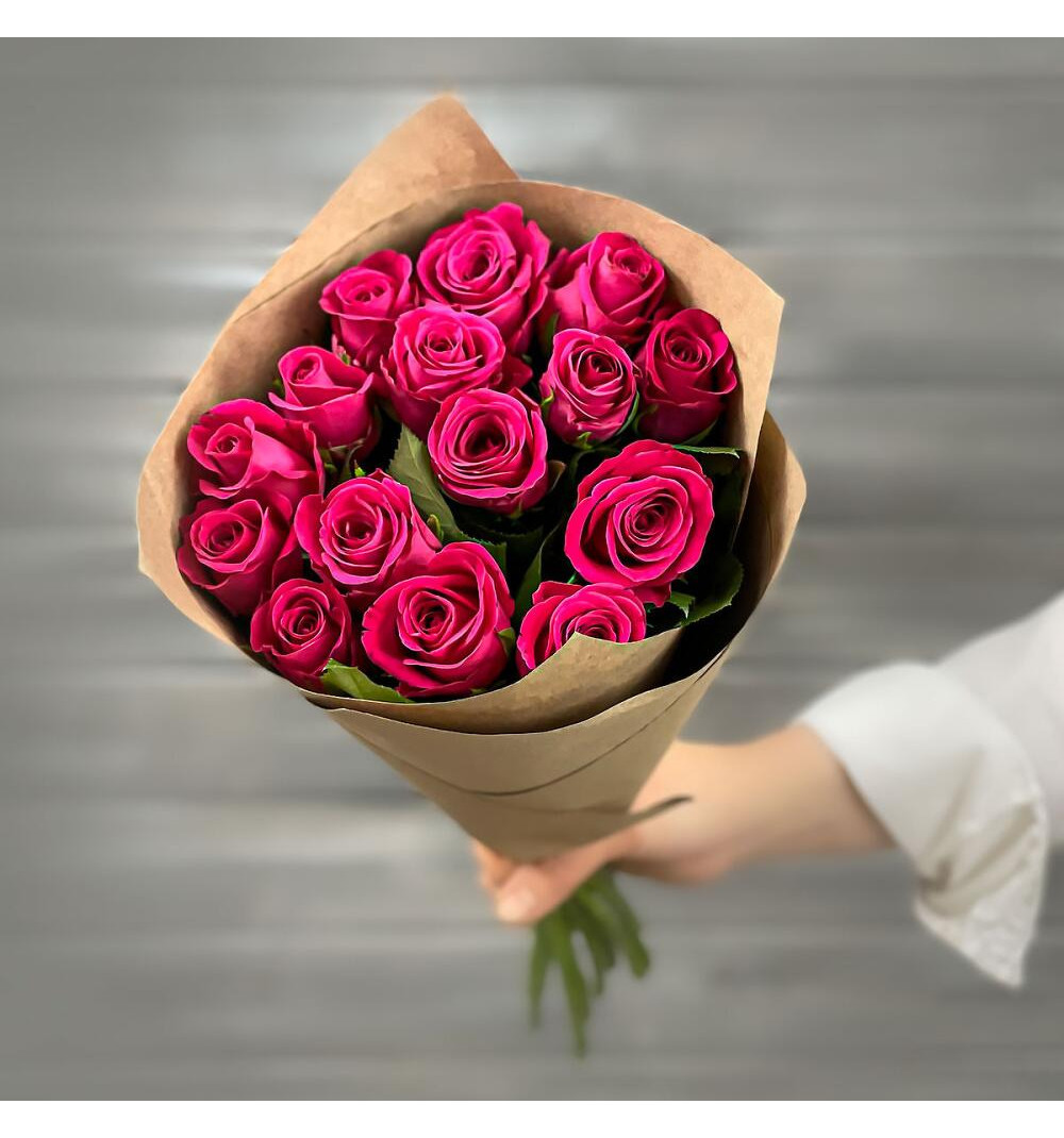 Изысканный букет из 15 малиновых роз с зеленью в крафте создает атмосферу страсти и романтики. Нежные лепестки роз и свежая зелень идеально дополняют друг друга, придавая букету утонченность и изящество. Этот букет станет прекрасным подарком для особого человека в особый день, а также замечательным способом выразить свои искренние чувства и заботу. Упаковка в крафте придает букету натуральный шарм и добавляет нотку природной простоты.