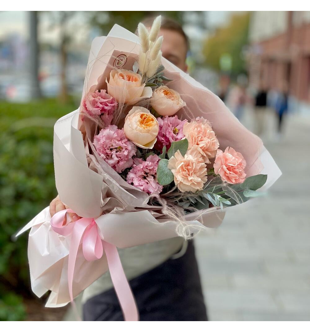 Букет с пионовидными розами «Джульетта», эустомой и диантусами